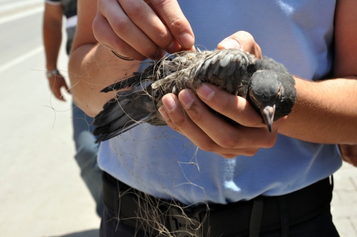 Karaçayır Mahallesi Panayır Sokak'ta bulunan bir binanın 5. katının balkonuna gerilen balık ağına ayağı takılan güvercini fark eden vatandaşlar, durumu itfaiye ekiplerine bildirdi.