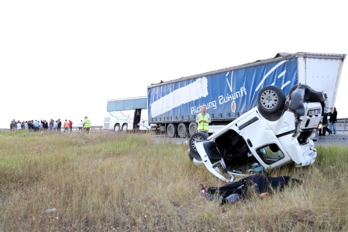 Kaza nedeniyle ulaşıma kapanan yolun açılması için polis ve Karayolu ekipleri çalışmalarını sürdürüyor.
