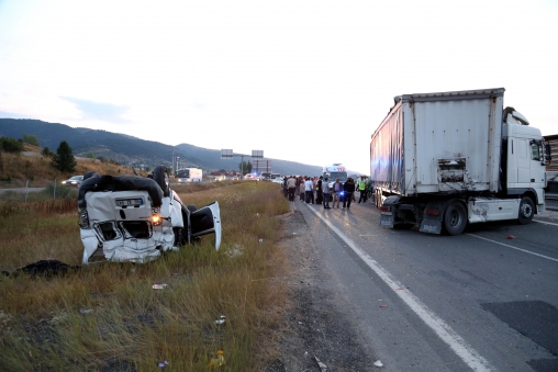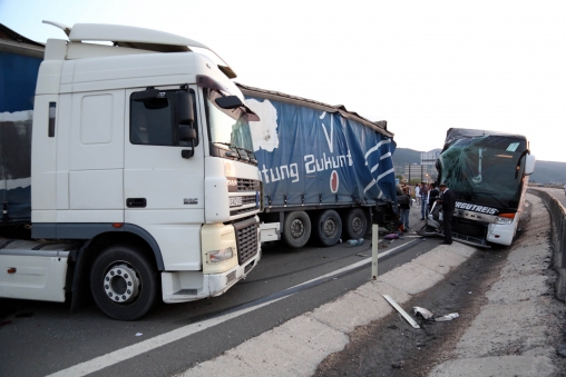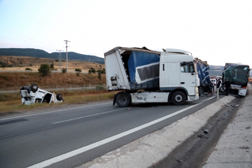 Alınan bilgiye göre, Karabük'ten Gerede istikametine seyreden Nugzar Sharashidez kontrolündeki PZ 089 yabancı plakalı tır, TEM Otoyolu Gerede bağlantı yolunda önünde seyreden Semih Alay'ın kullandığı 06 AZ 647 plakalı otomobile, Erkan Demir idaresindeki 36 Turgutreis 010 plakalı yolcu otobüsü de tıra çarptı.