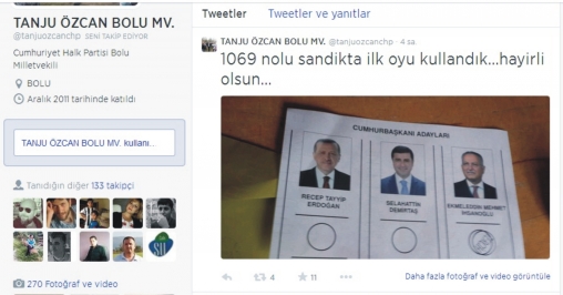 Tarihte ilk kez halkın cumhurbaşkanını seçeceği seçimler olaysız bir şekilde kentte sürüyor. Şu ana dek seçime damga vuran gelişmeye ise, CHP Bolu Milletvekili Tanju Özcan imzasını attı. İmam Hatip Lisesi’ndeki 1069 numaralı sandıkta oy kullanma işlemini gerçekleştiren Milletvekili Tanju Özcan, çatı aday Ekmeleddin İhsanoğlu’na oy verdiğini adeta ispatlarcasına kullandığı oyun cep telefonuyla fotoğrafını çekti, ardından da seçimlerdeki “gizli oy kullanma” ilkesini çiğneyerek, sosyal paylaşım sitesi aracılığıyla bu görüntüyü takipçileriyle paylaştı.