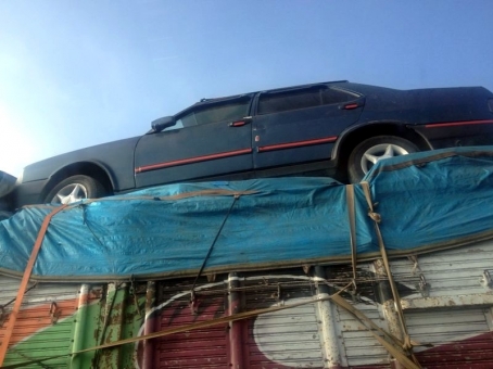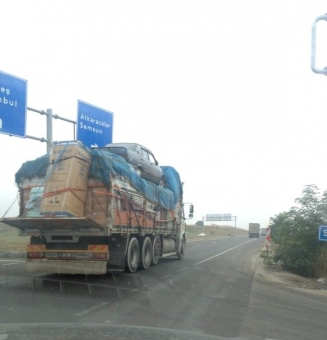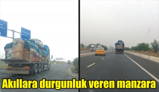 Sürücüleri hayretler içerisinde bırakan görüntü Bolu-Samsun Karayolu'nda çekildi. Ailesiyle birlikte göç taşıdığı tahmin edilen bir kamyon şoförü, kasadaki eşyaların üzerine şahin marka otomobili de yükledi. Eşyaların üzerindeki otomobili iple bağlayan sürücü, Karadeniz'e doğru yola koyuldu. Trafikteki sürücüler, kamyonun üzerindeki otomobili görünce büyük şaşkınlık yaşadı. Kamyon sürücüsü ise tehlikeye aldırmadan yoluna devam etti.