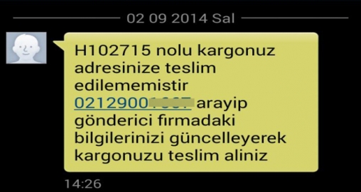 Dolandırıcılar artık yöntemleri arasına kargo mesaj sistemini dahil etti.Cep telefonuna ‘H102715 nolu kargonuz adresine teslim edilememiştir. Verilen numarayı arayıp gönderici firmadaki bilgilerinizi güncelleyerek kargonuzu teslim alınız’ mesajı gönderilerek kendilerinin aranmasını sağlayan dolandırıcılar telefon abonelerini kandırıyor.