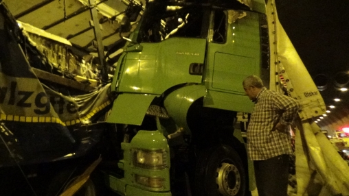 Alınan bilgiye göre, TEM otoyolunda Ankara yönüne giden Veysel Hacıoğlu idaresindeki 06 DSF 74 plakalı beyaz eşya yüklü TIR, Bolu Dağı Tüneli'nde önünde seyreden Romanya uyruklu Dragos Daniel Tolontan yönetimindeki yabancı plakalı şampuan yüklü tıra çarptı.