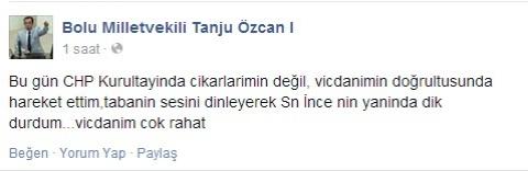 CHP’li Özcan, Facebook aracılığıyla yaptığı açıklamada, kurultayda neden Muharrem İnce’ye destek verdiğini açıkladı. “Çıkarlarım değil, vicdanımın doğrultusunda hareket ettim” diyen Özcan, parti tabanının da İnce’yi desteklediğini iddia etti ve Kılıçdaroğlu’nu yaptığı açıklamalarla iyice karşısına aldı. Özcan açıklamalarında şu ifadeleri kullandı: “Bugün CHP Kurultayı’nda çıkarlarımın değil, vicdanımın doğrultusunda hareket ettim. Tabanın sesini dinleyerek Sayın İnce’nin yanında dik durdum... Vicdanim çok rahat!”