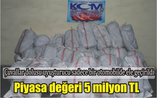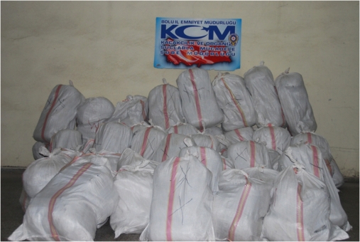 Bolu İl Emniyet Müdürlüğü Kaçakçılık ve Organize Suçlarla Mücadele Şube Müdürlüğü ekipleri, kentte uyuşturucu madde ticareti yapan şahısların tespiti ve yakalanması için yaptıkları operasyonda, M.B isimli şahsın sürücülüğünü yaptığı 34… plakalı aracı durdurdu. …. Araçta yapılan aramada 1 ton kubar esrar maddesi ele geçirildi. Olayla ilgili olarak araç şoförü M.B gözaltına alındı.