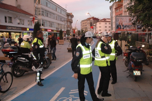 Kent merkezinde İzzet Baysal Caddesi’nin araç trafiğine kapatılmasından sonra yeni uygulamalar da hayata geçti. Son olarak iki haftalık çalışmadan sonra İzzet Baysal Caddesi’ne Belediye Meydanı’ndan Hükümet Meydanı’na kadar mavi boyalarla bisiklet yolu yapıldı. Ancak motosiklet sürücüleri ısrarla işlek caddeye girerek yayalar arasında sürüş yapmaya devam etti. Harekete geçen Bolu Emniyet Müdürlüğü Trafik Tescil ve Denetleme Şube Müdürlüğü’ne bağlı ekipler, yunus ekibiyle birlikte motosiklet sürücülerine yönelik uygulama yaptı. Maviye boşanan ve şeritlerle güzel bir görünüme kavuşan bisiklet yolunda motosiklet kullanan sürücüler polis ekiplerine yakalandı. Karşılarında polisi görünce şaşkına dönen motosiklet sürücülerine ceza yağdı.