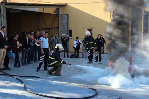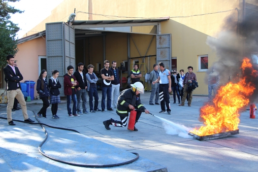 Daha sonra itfaiye ekipleri tarafından itfaiye müdürlüğü önünde yangın tatbikatı yapıldı.Tatbikatta yaşanabilecek olası yangınlarda, okullarda, evlerde ve iş yerlerinde bulunan yangın tüplerinin kullanımı hakkında uygulamalı eğitim verildi.