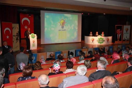 AK Partimiz kurulduğundan bugüne bize inanan, dualar eden milletimize mahcup olmadık. Başkalarının hayal bile edemediklerini AK Parti kadroları gerçekleştirdi. Ülkemizi hayatın her alanında kalkındırarak dünyada ekonomik ve sosyal alanda 26’ıncı sıradan 17’inci sıraya taşıdık ve bu ülkeyi yardım alan değil yardım eden, söz dinleyen değil sözü dinlenen bir ülke yaptık. Emeği geçen herkese teşekkürlerimizi sunuyoruz. Bu başarının gerçek mimarı, kurucu genel başkanımız başbakanımız ve cumhurbaşkanımız liderimiz Recep Tayip Erdoğan’a sonsuz şükranlarımızı sunuyoruz. Daha yolun başındayız daha büyük hedeflerimiz var. Ortaya koyduğumuz bu hedefleri gerçekleştirmek için daha çok çalışacağız. Aşkımızı, heyecanımızı, sevdamızı yitirmeden daha çok çalışacağız ve bu ülkeyi hak ettiği yere getireceğiz. Bolu AK Parti kurulduğu günden beri liderimize ve partimize sahip çıktı. Her seçimde oyunu artırarak desteğini esirgemedi inşallah bu destek artarak devam edecek. Ülkemiz büyük bir değişim yaşadı Bolu’da bu değişimden nasibini aldı. Son on yılda Bolumuzda 6 katrilyonluk yatırım gerçekleştirildi. Bu küçümsenecek bir rakam değil.”