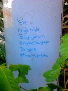 Bir yılını dolduran şiirsokakta hareketi Bolu’da da hız kazandı.Geçen yıl 3 Eylül 2013’te sosyal medyada açılan https://twitter.com/siirsokakta ile https://www.facebook.com/ikinciyeni hesaplarıyla #siirsokakta hareketi başlamıştı. Duvarlara, kaldırımlara, otobüslere, köprü altlarına sevdiği dizeleri yazanlar, yaptıkları eylemin fotoğrafını çekip sosyal medyada paylaşarak harekete destek verdiler. En çok dizeleri paylaşılan şairler Turgut Uyar, Özdemir Asaf, İsmet Özel, Edip Cansever, Can Yücel, Cemal Süreya, Ahmet Arif, Didem Madak… Gençlerin çok sevdiği #şiirsokakta giderek büyüdü.