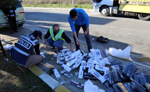 Araçta, narkotik köpeğiyle yapılan aramada çuval içerisinde 2 bin 300 paket sigara bulundu. Tır sürücüsü Abdulaziz B, gözaltına alındı.