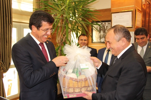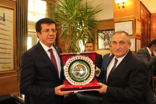 Belediye ziyaretinde Ekonomi Bakanı Nihat Zeybekci’yi Belediye binası önünde Belediye Başkanı Alaaddin Yılmaz, Başkan Yardımcısı Hüseyin İka ve Belediye meclis üyeleri karşıladı.