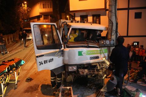 Karamanlı Mahallesi Ferit Talay Caddesi'nde freni boşalan Burhan Çelik yönetimindeki 34 RV 609 plakalı çöp kamyonu, iki evin duvarına, ardından da beton aydınlatma direğine çarparak durabildi.