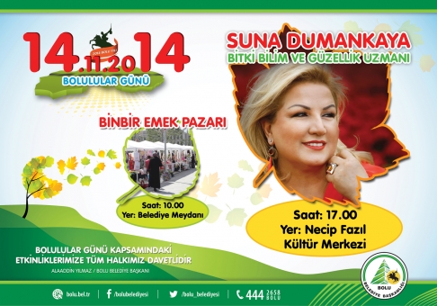 Her ayın 14’ünde kutlanan Bolulular Günü 14 Kasım 2014 Cuma günü Belediye Meydanı ve Necip Fazıl Kültür Merkezi’nde gerçekleştirilecek etkinliklerle kutlanacak. Yine el emeği göz nuru ürünlerin stantlarda sergileneceği kutlamalarda, ünlü Bitki Bilim ve Güzellik Uzmanı Suna Dumankaya sevenleri ile bir araya gelecek. Kutlanmaya başladığı günden bu güne Bolulular Günü’nün klasiği haline gelen Binbir Emek Pazarı saat: 10.00’da Belediye Meydanındaki stantlarda açılacak.