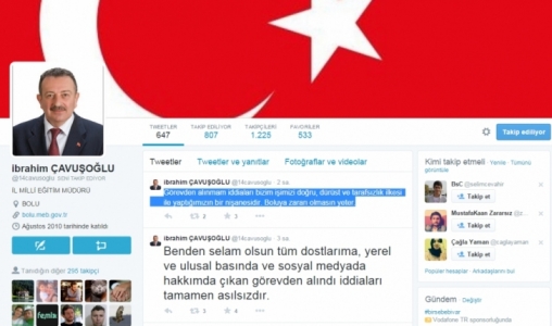 İl Milli Eğitim Müdürü İbrahim Çavuşoğlu sessizliğini bozdu. Hafta sonu ulusal medyada yayınlanan haberlerde görevden alındığı iddia edilen Çavuşoğlu, sosyal medya aracılığıyla yaptığı açıklamalarla görevinin başında olduğunu belirtti.