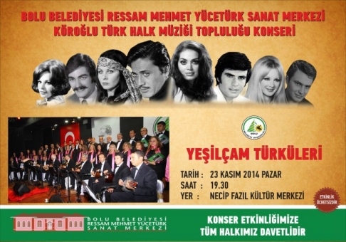 Bolu Belediyesi Ressam Mehmet Yücetürk Sanat Merkezi Köroğlu Türk Halk Müziği Korosu, düzenlenecek konserde Yurdumuzun çeşitli yörelerinden 25 adet türkü ile Bolu halkının karşısına gelecekler. “Yeşilçam Türküleri” adlı, nostalji kokan Yeşilçam filmlerinin de perdeye yansıtılacağı konserde film müzikleri ile Öğretmenlere hitaben şiir ve türküler icra edilecek.