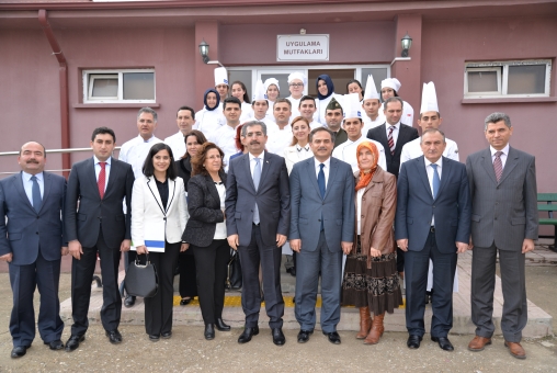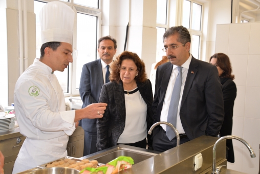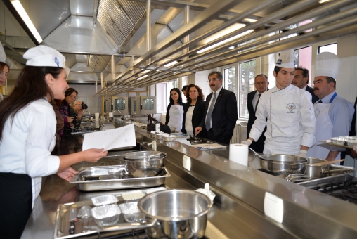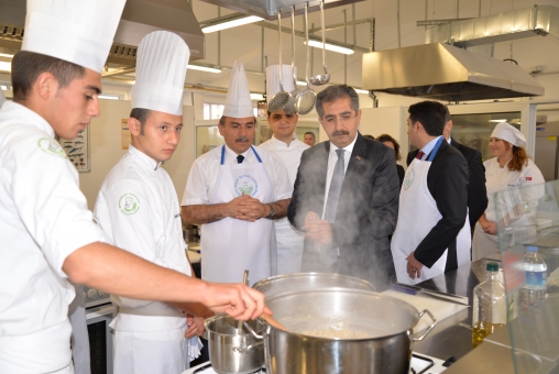 'Akademisyen Şeflerden Tadımlık Kurslar' projesi kapsamında kurs veren öğretim görevlileri Fuat Bayram, Zuhal Özdemir ve Ali Kemal Kemer konuklarına okulun uygulama mutfağında kuzu tandır, baklava ve salatanın nasıl yapılacağını gösterdiler. Tezgahın başında toplanan Vali Ahmet Zahteroğulları ve eşi Mahire Zahteroğulları ile Kaymakam ve belediye başkanları akademisyen aşçıları dikkatle izlerken, püf noktaları hakkında da sorular yönelttiler.