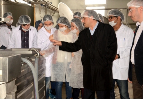 2011 yılından bu yana Paşaköy’deki fabrikasında günde 5 bin litre sütten, süt ürünleri üretimi yapan İkizler Süt ve Süt Ürünleri Tic. Ltd. Şti.’yi gezen öğrenciler, Gıda Mühendisi Gökhan Güler’den ayran, yoğurt, süzme yoğurt, beyaz peynir, kaşar ve lor peyniri ile yöresel ürünler ve keş’in yapımı hakkında bilgi aldılar. Rektör Coşkun, burada yaptığı konuşmada, Üniversite olarak öğrencilerinin teorik derslerini sanayi kollarında uygulayarak öğrenmelerini çok önemsediklerini ifade ederek, “Bugün Gıda Mühendisliği Bölümü öğrencilerine verdiğim Süt ve Süt Ürünleri Teknolojisi dersinin uygulamalarını İkizler Süt’te yapmaktayız. Bu vesileyle öğrencilerimize böyle bir imkanı sağladıkları ve eğitim desteği verdikleri için İkizler Süt’e teşekkür ediyorum” dedi.