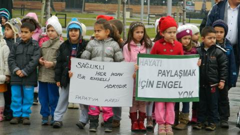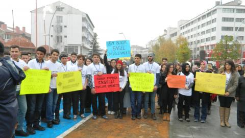 Papatya Kreşi öğrencileri ellerinde “Hayatı paylaşmak için engel yok”, “Sağlıklı Her insan bir engelli adayıdır” yazılı pankartlarla törendeki yerlerini aldılar. Atatürk anıtına çelenk konulmasının ardından engelliler, bisiklet yolu üzerinden cadde boyunca yürüyüş gerçekleştirdiler.