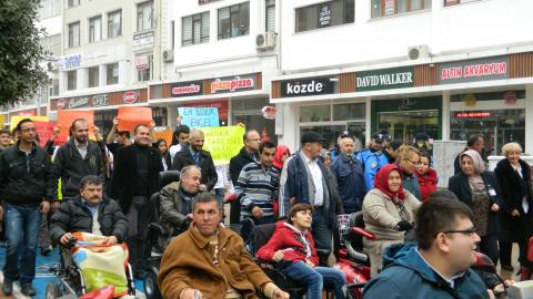 Şehirdeki trafiğin cadde ve sokakların engellilere uygun olmaması nedeniyle evlerine hapsolan engelliler, İzzet Baysal Caddesi’nde seslerini duyurmaya çalıştılar.