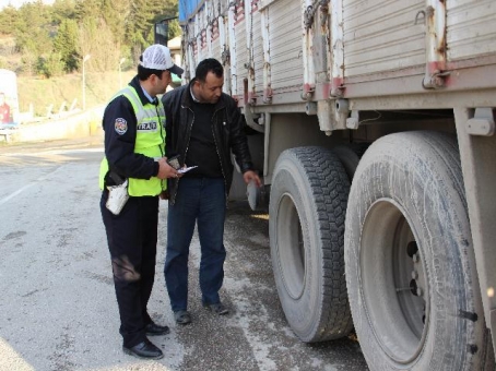 Ekipler tarafından yol boyunda yapılan uygulamada araçlar durdurularak lastiklerinin dişleri ölçüldü.