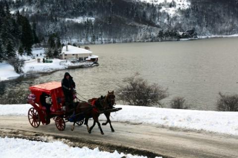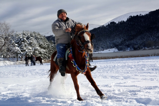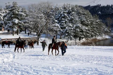 Kar yağışının ardından tatilcilerin akın ettiği Abant Tabiat Parkı çevresinde at ve faytonlarla gezi düzenleyerek para kazanan köylüler, kar sevincini yaşıyor.