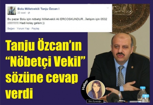 Ak Parti Bolu Milletvekili Ali Ercoşkun ile CHP Milletvekili Tanju Özcan arasında “Nöbetçi Milletvekili” polemiği başladı. Tanju Özcan soysal paylaşım sitesi Facebook hesabında “Bu Pazar Bolu için Nöbetçi milletvekili Ali Ercoşkun’dur. Hadi kolay gelsin” yazdıktan sonra Ali Ercoşkun’un cep telefonu numarasını verdi.