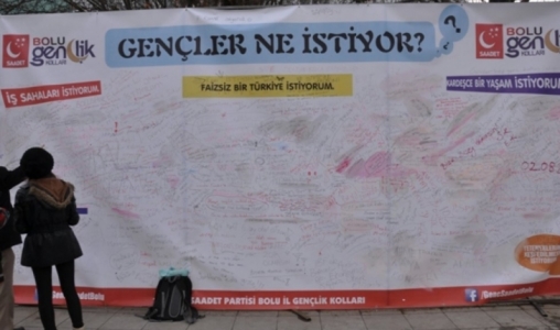 Saadet Partisi (SP) Bolu gençlik Kolları, gençlerin isteklerini açık açık dile getirmesi amacıyla cadde üzerine “Gençler ne istiyor?” yazan boş bir afiş astı. İzzet Baysal Caddesi üzerinde bulunan boş bir alana asılan dev afişte ‘Gençler ne istiyor?’ başlığı altında, “İş Sahaları istiyorum”, “Faizsiz bir Türkiye istiyorum” ve “Kardeşçe bir yaşam istiyorum” başlıklarının altına, vatandaşların isteklerini yazması için boş bir alan bırakıldı.