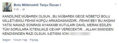 Tanju Özcan yazdığı iletide "Kandiliniz mübarek olsun... Bu mübarek gece nöbetçi Bolu Milletvekili Fehmi Küpçü arkadaşımızdır... Fehmi bey bu akşam yatsı namazı sonrası ayakkabı kutuları dahil merak edilen tüm sorulara içtenlikle cevap verecektir... Allah şimdiden kendisinden razı olsun” ifadelerini kullandıktan sonra Fehmi Küpçü’nün telefon numarasını yayınladı.