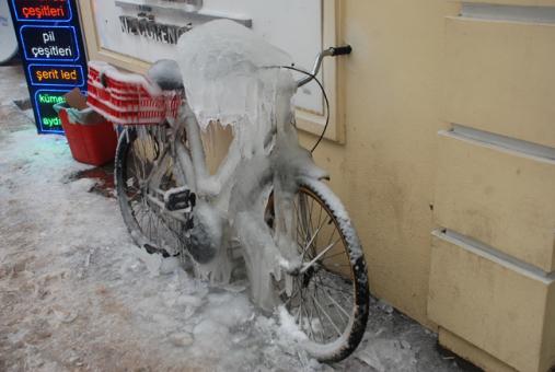 PTT Caddesi’nde bir vatandaşın dışarıda bıraktığı bisiklet soğuk hava edeniyle dondu. Hava sıcaklığının sıfırın altında seyrettiği Bolu'da dışarıda bırakılan ve tamamen buz tutan bisiklet kış ayının şiddetini ortaya koydu. Dondurucu soğukların ilerleyen günlerde de devam edeceği ifade edildi.
