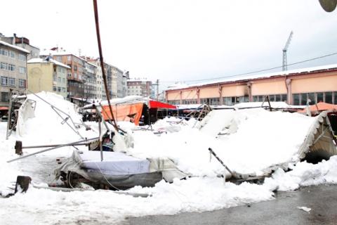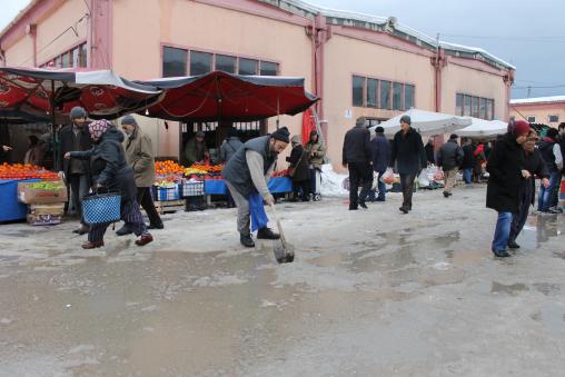 Bolu Belediyesi’ne ait ekiplerin Bolu Pazarında temizlik yapmaması nedeniyle önce tezgahlarının bulunduğu yerlerdeki karları küreklerle temizleyen esnaflar, ardından da karların erimesi nedeniyle oluşan göletlere önlem almaya çalıştılar. Karların arasından açtıkları kanallarla suların tahliyesini kendince yöntemlerle sağlamaya çalışan esnaflar, ısınabilmek için de zaman zaman tezgahların arkasında ateş yaktılar.