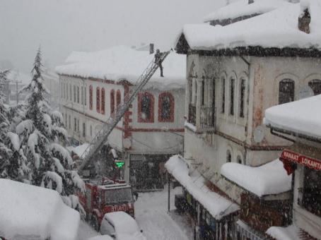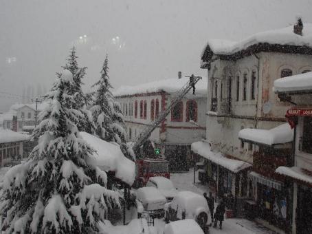 Bolu’nun Osmanlı’dan kalan tarihi konak ve evleriyle ünlü ilçesi Mudurnu‘da kar yağışı sürüyor. Mudurnu‘da evlerin çatılarında biriken karlar ve sarkan buzların tehlike oluşturması üzerine ilçede temizlik çalışması yapıldı.