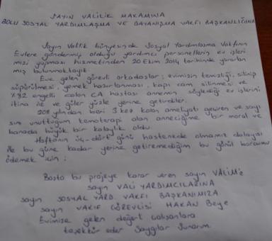 Engelli olan annelerinin 2011 yılından bu yana 3 kez kolon ameliyatı geçirdiğini ve kemoterapi aldığını ifade eden E.C ile A.Ö, ASDEP projesi kapsamında kendilerine yardımda bulunan Bolu Valisi Ahmet Zahteroğulları’na ve emeği geçen herkese yazdıkları ortak mektup ile teşekkür ettiler.