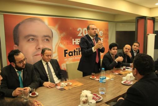 Ak Parti Merkez İlçe Teşkilatı ile bir araya gelen Fatih Metin burada yaptığı konuşmada; “Sizlerin bu partinin taşıdığı vebalin bilincinde olarak çalışan gayret ve sarf eden, o bilinç ve şuurla bir araya gelen arkadaşlarımızsınız. İşte bizim aradığımız ruhda bu ruhtur. Bolu Merkezde bu ruhun gerçekleşmiş olması da bizim için ayrı bir memnuniyet verici olaydır geleceğe ilişkinde bizi rahatlatmaktadır” dedi.