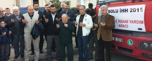 İHH Bolu Gönüllüleri Suriye’ye yardım için toplanan yiyecek yüklü tır uğurlamak için Siteler Camii önünde toplandı. Burada açıklama yapan İHH Bolu Şube Başkanı Fethi Sarımsakçı; “Suriye’de gün geçtikçe daha da derinleşen insani krize bir kez daha müdahil olabilmek, Esed’in varil bombalarının yanı sıra açlık ve soğukla da mücadele eden mazlum Suriye halkına destek olabilmek amacıyla teşkil edilen ve ‘Komşuluk Hakkı’ sloganıyla yola çıktığımız. İnsani Yardım TIR’larımızın 16.’sını ve 2015 yılının da ilk tırını bugün gönderiyoruz” diye konuştu.