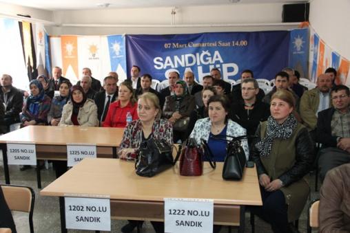 İl Başkanı Yüksel Coşkunyürek, Bolu Belediye Başkanı Alaaddin Yılmaz, İl Genel Meclis Başkanı Yaşar Yüceer, Kadın Kolları İl Başkanı Arzu Aydın'da, Adil Esen başkanlığındaki Merkez İlçe Teşkilatı tarafından yapılan toplantıları yerinde incelemek üzere Kültür İlköğretim Okulu'na gelerek, sandık görevlileri ile bir araya geldi. Çok sayıda partilinin yer aldığı toplantıda 22'nci dönem Ak Parti Bolu Milletvekili Mehmet Güner, Milletvekili aday adayları Mehmet Altun, Adalet Karadayı, Osman Şevki Çelebi'de yer aldı.