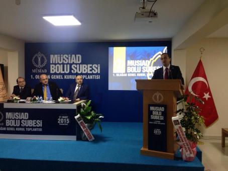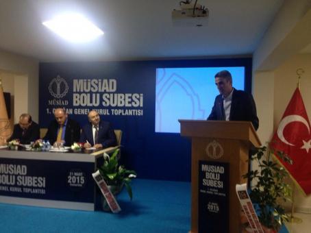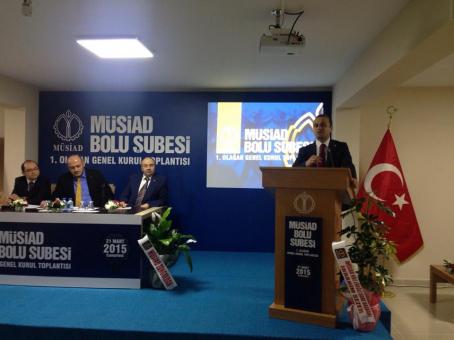 MÜSİAD Bolu Şubesi’nin kurucu başkanı Eyüp Uzun genel kurul konuşmasında, Türkiye’nin 2023 hedefleri doğrultusunda, Bolu’da iş çevrelerinin üzerine düşen sorumlulukları yerine getirmesi amacıyla kentte teşkilatlandıklarını belirterek, “Hz. Ebu Bekir’in ticari ahlakı, Ahi Evran’ın öğütleri doğrultusunda çalışmalar yapıyoruz!” dedi.