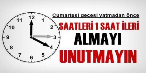 Mart ayının son haftasındaki Pazar günü "yaz saati" uygulaması başlıyor. Mart ayının sonunda yani bu hafta sonu saatler 1 saat ileri alınıyor. Saatler tam olarak 28 Mart Cumartesi gününü, 29 Mart 2015 Pazar gününe bağlayan gece olacak.