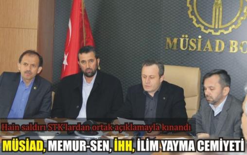 Müstakil Sanayici İşadamları Derneği (MÜSİAD) Bolu Şubesi, Memur-Sen, Bolu İnsan Hakları ve Hizmet Derneği (İHH) ve İlim Yayma Cemiyeti Bolu Şubesi, MÜSİAD Bolu Şubesi hizmet binasının ev sahipliği yaptığı basın toplantısında bir araya geldi. Saat 14.00’teki açıklamada, sivil toplum kuruluşları hain saldırıyı kınadı.