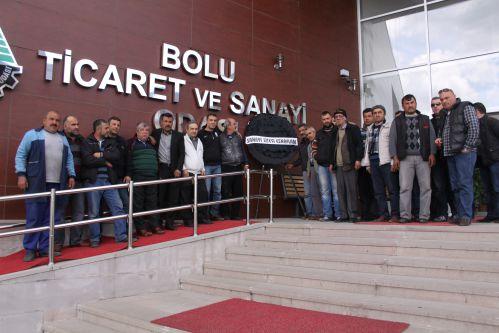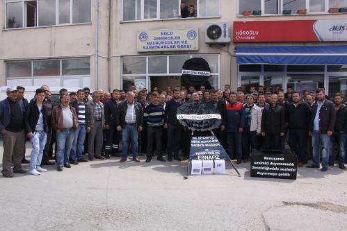 4 yıldır Belediye Başkanı Alaaddin Yılmaz’ın kendilerine yakışıksız şekilde davrandığını savunan esnaflar şu açıklamaları yaptılar: “Alaaddin Yılmaz’ın bizlere yönelik tehditvari açıklamaları neticesinde sanayi esnafları olarak tepkimizi ve bu oluşumun karşısında olduğumuzu göstermek amacı ile Bolu Belediyesi binası önüne siyah çelenk bırakarak belediye başkanımızı kınıyoruz. Bizler 2011 yılında yine başkanımızın tehditkar açıklamalarıyla bu oluşuma gönülsüz olarak, baskı ile katılmıştık. Kendi aramızda birlik ve beraberlik yoktu, buradan başkana çok teşekkür ediyoruz. Bizleri birlik ve beraberlik içinde olmaya ve aynı şekilde düşünmeye zorlayıp bir araya getirdiği için. Sanayi sitesi 600’den fazla esnafın işyeri sahibi olduğu, kişisel olarak mücadele yapılmayan bir topluluktur. Biz sanayi esnafları olarak hiçbir tehdide boyun eğmeyiz. Bizim üzerimizden bugüne kadar rant sağlanmıştır ve bu rant bazılarının hoşuna gitmiş olmalıdır ki, çalınan paraların, faizlerin, alınan icra arsaların, kazanılan davalardan çıkan sonuçlarda ortada iken, bir görevi kötüye kullanma varken, bir belediye başkanı tehdit edeceği yeri karıştırmış olmalı, ya da bu işte ki beceriksizliğini kapatma çabası içindedir. Hesap sorup, tehdit edeceği yer BESOB’dur. Tüm Bolu halkı görecek ki ilerleyen günlerde eski proje iptal edilecek ve yeni bir oluşum, yeni kişiler devreye sokularak esnaf yine yerinden edilmeye çalışılacaktır. Bolu sanayi sitesi bizim evimizdir. Amaç mevcut sanayi sitesinin yerini ele geçirmektir. Sanayi sitesi bizimdir ve bizim kalacaktır.”