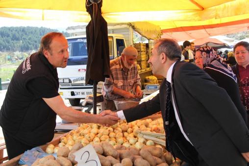 Sabahtan öğle saatlerine kadar Mengen Pazarını gezen ak kadrolar daha sonra ilçe merkezindeki işyerlerini ziyaret etti. Esnaflarla bir araya gelen Fehmi Küpçü ve Mehmet Emin Güz, 7 Haziran seçimlerinden sonra ülkedeki istikrarın devam etmesiyle birlikte Mengen’in daha da kalkınıp gelişeceğini belirttiler.
