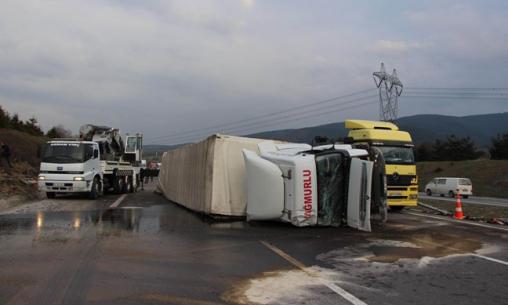 Edinilen bilgiye göre, kaza saat 19.00’da TEM Otoyolu’nun Yeniçağa mevkiinde meydana geldi. Ankara yönünden İstanbul istikametine giden Mehmet Birelli yönetimindeki 27 Z 2071 plakalı TIR, sürücünün direksiyon hakimiyetini kaybetmesiyle devrildi. TIR’ın sürücüsü olay yerine gelen 112 sağlık ekipleri tarafından İzzet Baysal Eğitim ve Araştırma Hastanesi Köroğlu Ünitesi'nde tedavi altına alındı. Sürücünün sağlık durumunun iyi olduğu belirtildi. Kaza sonrasında devrilen TIR vinçle çekilerek trafik ulaşıma açıldı.