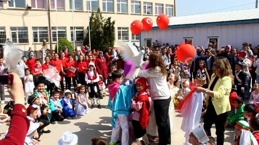Programa saygı duruşu ve İstiklal Marşının okunmasıyla başlandı. İlk Okul Müdürü Fuat Bayramoğlu, günün anlam ve önemini belirten konuşması sonrası, okulun 2.sınıftan yetmiş bir öğrencinin “Dünya Çocukları” adlı rondu sunarlarken, her bir çocuk dünyanın üzerindeki ülkelerden birisinin milli kıyafetlerini giyerek, rontlarını sürdürmeleri beğeni topladı. Ront sonunda gökyüzüne barış balonları bırakılırken, aynı anda öğrencilerce 10 tane barış güvercini uçuruldu.