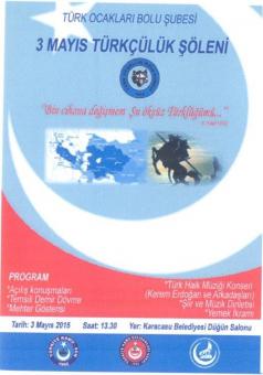 Türk Ocakları Bolu Şube Başkanı Yrd. Doç. Dr. Hamdi Zenginbal 3 Mayıs Pazar Günü saat 13.00’te Karacasu Belediyesi Düğün Salonu’nda yapılacak olan törene tüm Bolu halkını davet ederek, Bolu’nun Türkçülük Günü’nü kutladı.
