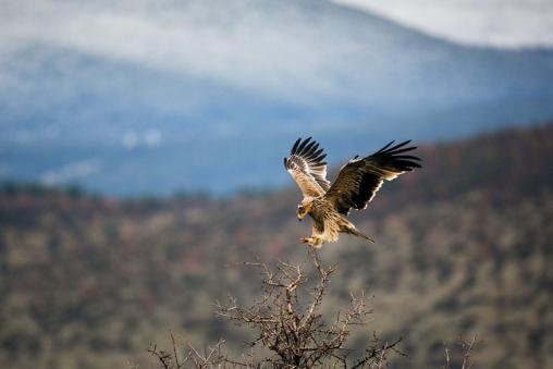 Fotoğraf: Bolu- Dörtdivan’a bağlı Sorkun köyünde akbabaları korumak amacıyla kurulan besleme istasyonuna çevredeki pek çok yırtıcı da geliyor. Şahkartal da (Aquila heliaca) bunlardan biri. Yıl boyu görülebiliyor. Alana geldiğinde hemen yüksekçe bir ağaca konup bekliyor. Uygun anı bulduğunda yerden bir parçayı kapıp havalanıyor.