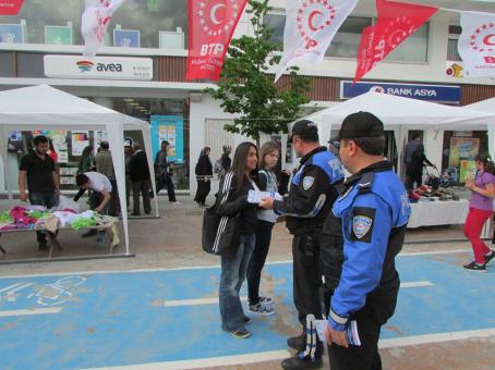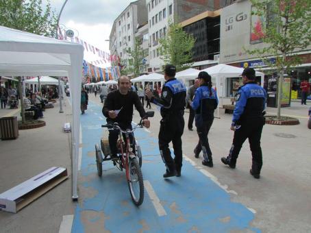 Bolu’da güneşli havaların açması ile İzzet Baysal Caddesi vatandaşlarla dolup taştı. Hafta başı İstanbul İstiklal Caddesini aratmayan görüntülere sahne olan Cadde’de Toplum Destekli Polislik Şube Müdürlüğüne bağlı ekipler vatandaşlara bisiklet yolu ile ilgili bilgi verdi. Ekipler olası kazalara karşı broşürle ve yüz yüze bilgi vererek bisiklet sürücülerini ve vatandaşları kendilerine ayrılan bölümlerde yürümeye teşvik etmek ve bu farkındalığı oluşturmak amacıyla bu çalışmayı başlattı. Dağıtılan broşürlerde yaya yolunda yürüyen vatandaşlar için, “Ben bisiklet yoluna girmem, peki ya siz? , Saygıya yeşil ışık yakalım, yaya yolunu kullanalım… , Yaya yolunda yürümek uygarlık gereğidir” uyarıları yer aldı. Broşür’ün diğer yüzünde bisiklet sürücülerine uyarı niteliği taşıyan, “Lütfen bisiklet yolunu kullan! , Bisiklet yolunun dışına çıkma! , Bisikletin yaya yoluna girmesi tehlikeli ve yasaktır” sloganları yer aldı.