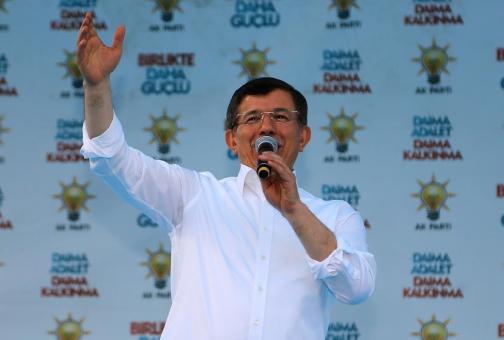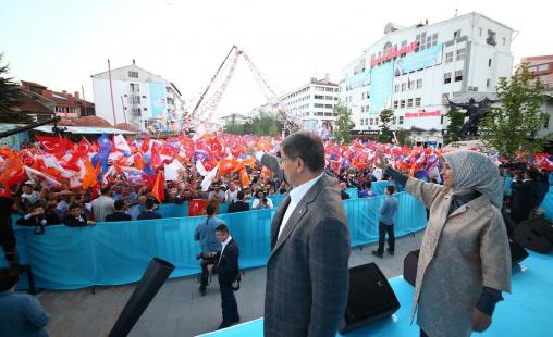 Miting alanına seçim otobüsü ile gelen Davutoğlu, yaklaşık 20 bin kişinin miting alanını ve İzzet Baysal Caddesi'ni boydan boya doldurduğu eşi Sare Davutoğlu ile birlikte halkı selamladı.