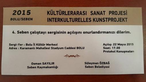 16-21 Mayıs 2015 tarihleri arasında gerçekleştirilen Türkiye- Almanya Kültürlerarası Sanat Projesi çalıştayında ortaya çıkan eserler, 22 Mayıs 2015 tarihinde, saat 17.00 de Bolu İl Kültür Merkezi Sanat Galerisi’nde sanatseverlerle buluşacak.