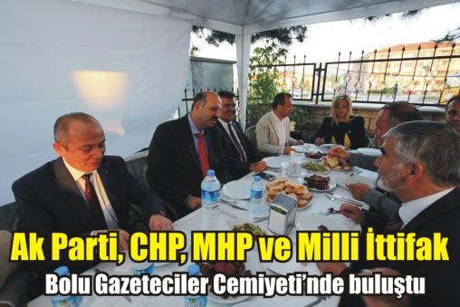 7 Haziran’da yapılacak milletvekili seçimlerine 2 hafta kala, Bolu Gazeteciler Cemiyeti siyasileri bir araya getirdi. Hisar Taksi Kavşağı’nda bulunan Bolu Gazeteciler Cemiyeti (BGC) Sosyal Tesisleri’nin bahçesinde düzenlene n mangal partisine, Bolu Belediye Başkanı Alaaddin Yılmaz, AK Parti Bolu Milletvekili ve adayı Ali Ercoşkun, CHP Bolu Milletvekili ve adayı Tanju Özcan, CHP Milletvekili adayı Yusuf Renkli, MHP Milletvekili adayları Şükrü Gülez, Kader Garipoğlu, Mihriban Budak, SP-BBP ittifakı Milletvekili adayları Veysel Çetinkaya ve Muzaffer Boyacı, CHP İl Başkanı Kazım Karsu, MHP İl Başkanı Mehmet Aydın, BBP İl Başkanı Mahmut Alan, SP İl Başkanı İbrahim Karagöz, AK Parti Kadın Kolları Başkanı Arzu Aydın, CHP Kadın Kolları Başkanı Zuhal Toker Işın, MHP Kadın Kolları Başkanı Hatice Öz, AK Parti Gençlik Kolları Başkanı Taha Furkan Sönmezel, CHP Gençlik Kolları Başkanı Eda Bayraktar, CHP Merkez İlçe Gençlik Kolları Başkanı Tahsin Mert Karagöz, çok sayıda gazeteci ve partili katıldı.