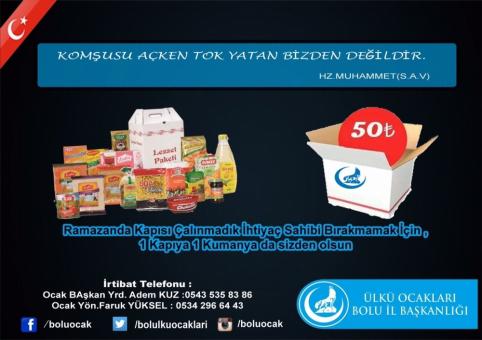Peygamber Efendimizin ; ‘Komşusu açken tok yatan bizden değildir’ hadisinden yola çıkan Ülkü Ocakları Bolu Şubesi, ilimizdeki ihtiyaç sahibi ailelere Ramazan ayı boyunca erzak ve kumanya yardımında bulunacak.
