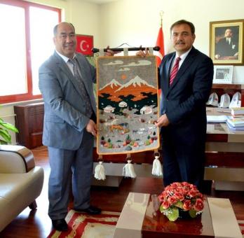 Ziyarete, Osh Devlet Üniversitesi İlahiyat Fakültesi Dekanı Dr. Samagan Mırzaibraimov ile AİBÜ İlahiyat Fakültesi Dekanı Prof. Dr. Süleyman Mollaibrahimoğlu da katıldı. Ziyaret kapsamında Rektör Coşkun, iki üniversitenin rektörlerine Üniversitemizin çini tabaklarını armağan etti; Prof. Dr. Isakov ile Prof. Dr. Bekbolotovich ise Rektör Coşkun’a keçeden yapılmış yöresel hediyeler takdim ettiler.